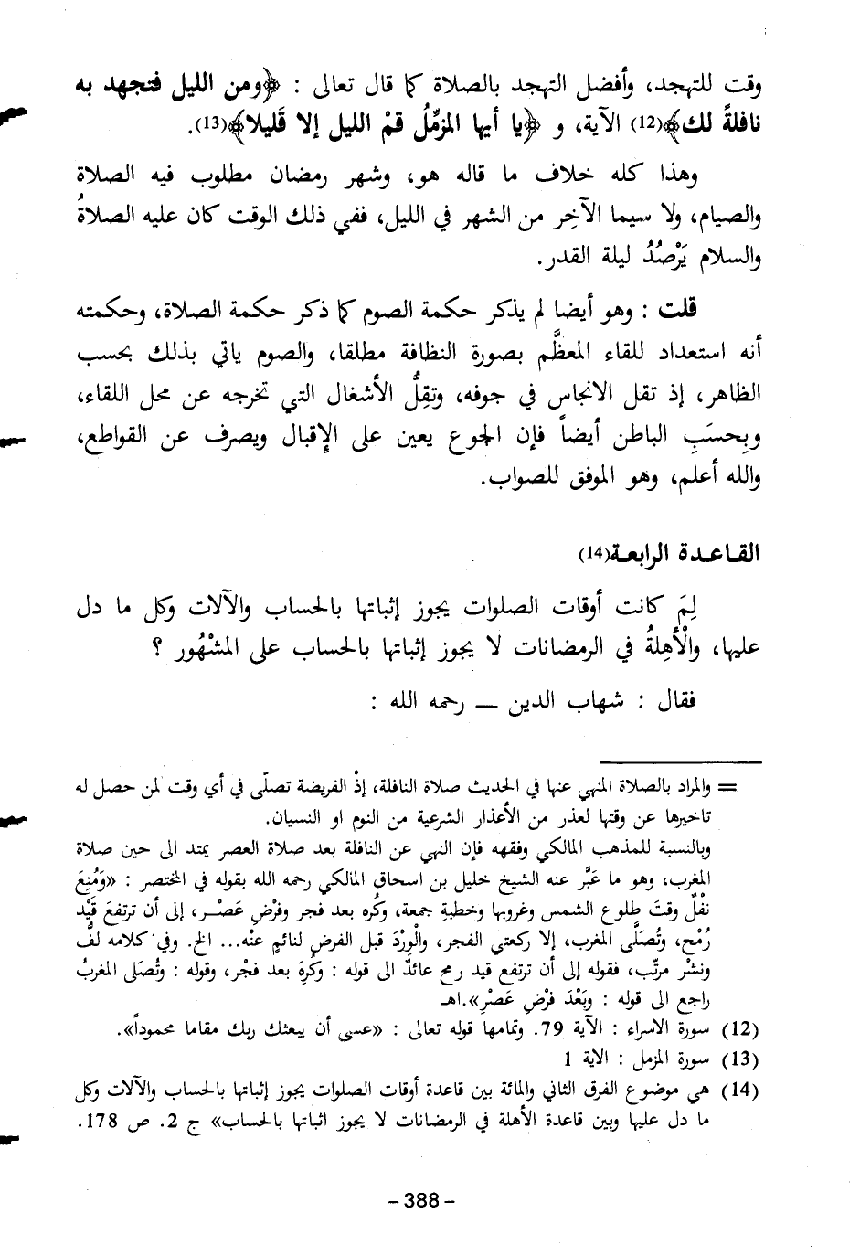 (١٤) هي موضوع الفرق الثاني والمائة بين قاعدة أوقات الصلوات يجوز إثباتها بالحساب والآلات وكل ما دل عليها وبين قاعدة الأهلة في الرمضانات لا يجوز اثباتها بالحساب" جـ ٢. ص ١٧٨.