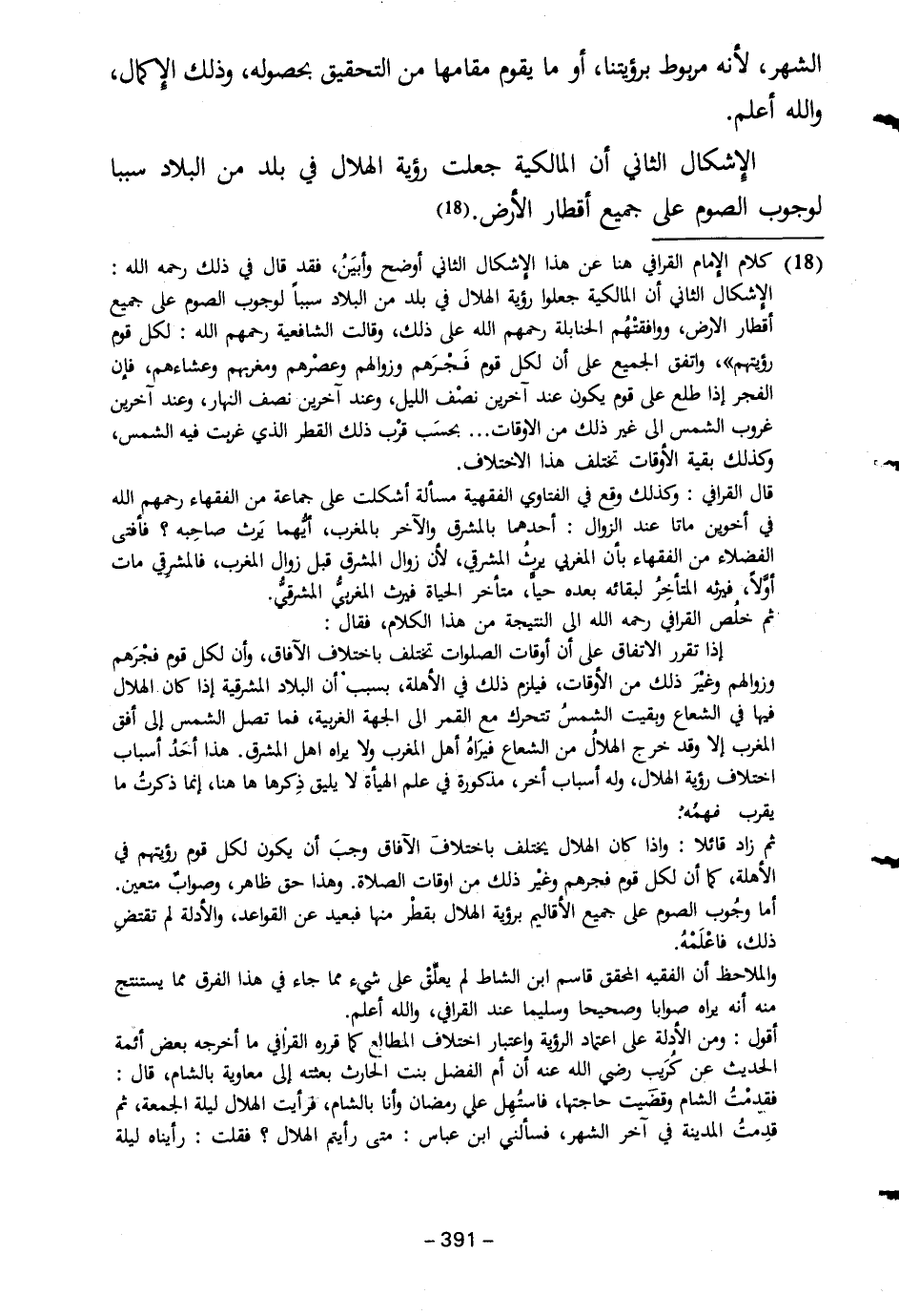 (١٨) كلام الإِمام القرافي هنا عن هذا الإِشكال الثاني أوضح وأبيَنُ، فقد قال في ذلك رحمه الله: الإِشكال الثاني أن المالكية جعلوا رؤية الهلال في بلد من البلاد سببا لوجوب الصوم على جميع أقطار الارض، ووافقتْهُم الحنابلة رحمهم الله على ذلك، وقالت الشافعية رحمهم الله: لكل قوم رؤيتهم"، واتفق الجميع على أن لكل قوم فَجْرَهم وزوالهم وعصْرهم ومغربهم وعشاءهم فإن الفجر إذا طلع على قوم يكون عند آخرين نصْف الليل، وعند آخرين نصف النهار، وعند آخرين غروب الشمس إلى غير ذلك من الاوقات ... بحسَب قرْب ذلك القطر الذي غربت فيه الشمس، وكذلك بقية الأوقات تختلف هذا الاختلاف.