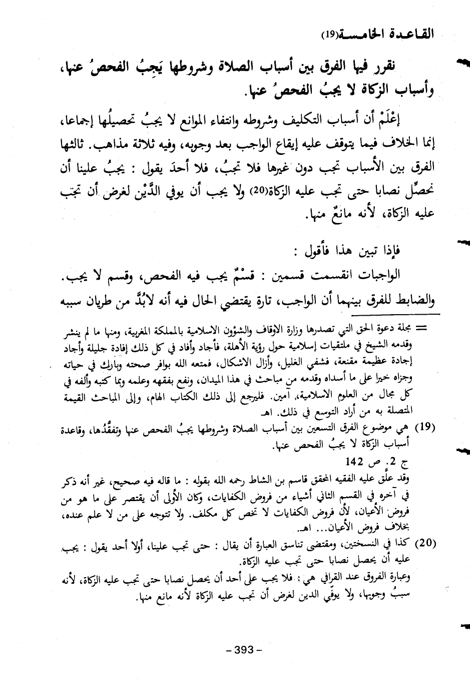 (١٩) هي موضوع الفرق التسعين بين أسباب الصلاة وشروطها يجبُ الفحص عنها وتفقدُها، وقاعدة أسباب الزكاة لا يجبُ الفحص عنها. جـ ٢. ص ١٤٢