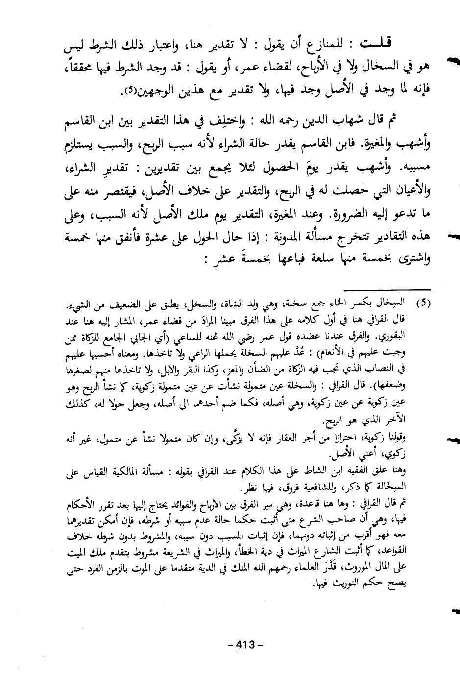 ثم قال شهاب الدين رحمه الله: واختلِف في هذا التقدير بين ابن القاسم وأشهب والغيرة. فابن القاسم يقدر حالة الشراء لأنه سبب الربح، والسبب يستلزم مسببه. وأشهب يقدر يومَ الحصول لئلا يجمع بين تقدورين: تقدرِ الشراء، والأعيان التي حصلت له في الربح، والتقدر على خلاف الأصل، فيقتصر منه على ما تدعو إليه الضرورة. وعند المغيرة، التقدير يوم ملك الأصل لأنه السبب، وعلى هذه التقادير تتخرج مسألة الدونة: إذا حال الحول على عشرة فأنفق منها خمسة واشترى بخمسة منها سلعة فباعها بخمسةَ عشر: