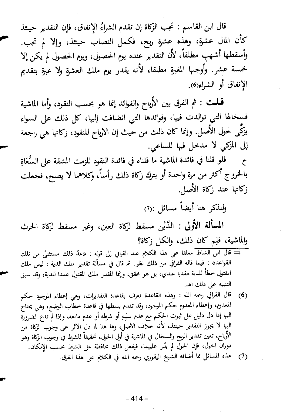 (٦) قال القرافي رحمه الله: وهذه القاعدة تعرف بقاعدة التقديرات، وهي إعطاء الموجود حكم العدوم، وإعطاء العدوم حكم الموجود، وقد تقدم بسطها في قاعدة خطاب الوضع، وهي يحتاج اليها إذا دل دليل على ثبوت الحكم مع عدم سبَبهِ أو فرطه أو عدم مانعه، وإذا لم تدع الضرورة اليها لا يجوز التقدير حينئذ، لأنه خلاف الاصل، وها هنا لما دل الاثر على وجوب الزكاة من الأرباح، تعين تقدير الربح والسخال في الماشية في أول الحول، تحقيقاً للشرط في وجوب الزكاة وهو دوران الحول، فإن الحول لم يدُر عليهما، فيفعل ذلك محافظة على الشرط بحسب الإمكان.