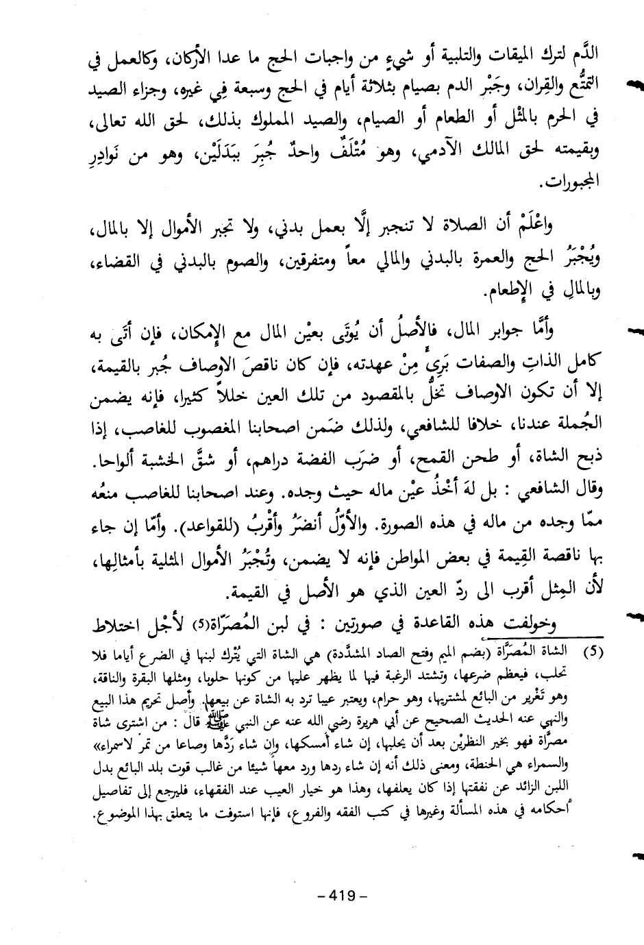 (٥) الشاة المُصَراة (بضم الميم وفتح الصاد المشدَّدة) هي الشاة التي يُتْرك لبنها في الضرع أياما فلا تحلب، فيعظم ضرعها، وتشتد الرغبة فيها لما يظهر عليها من كونها حلوبا، ومثلها البقرة والناقة، وهو تَغْرير من الباخ لمشتريها، وهو حرام، ويعتبر عيبا ترد به الشاة عن بيعها، واصل تحريم هذا البيع والنهى عنه الحديث الصحيح عن أبي هريرة ضى الله عنه عن النبي - صلى الله عليه وسلم - قال: من اشترى شاة مصرَّاة فهو بخير النظريْن بعد أن يحلبها، إن شاء أَمسكها، أإن شاء رَدَّها وصاعا من تمر لاسمراء" والسمراء هي الحنطة، ومعنى ذلك أنه إن شاء ردها ورد معها شيئا من غالب قوت بلد البائع بدل اللبن الزائد عن نفقتها إذا كان يعلفها، وهذا هو خيار العيب عند الفقهاء، فليرجع إلى تفاصيل أحكامه في هذه المسألة وغيرها في كتب الفقه والفروع، فإنها استوفت ما يتعلق بهذا الموضوع.