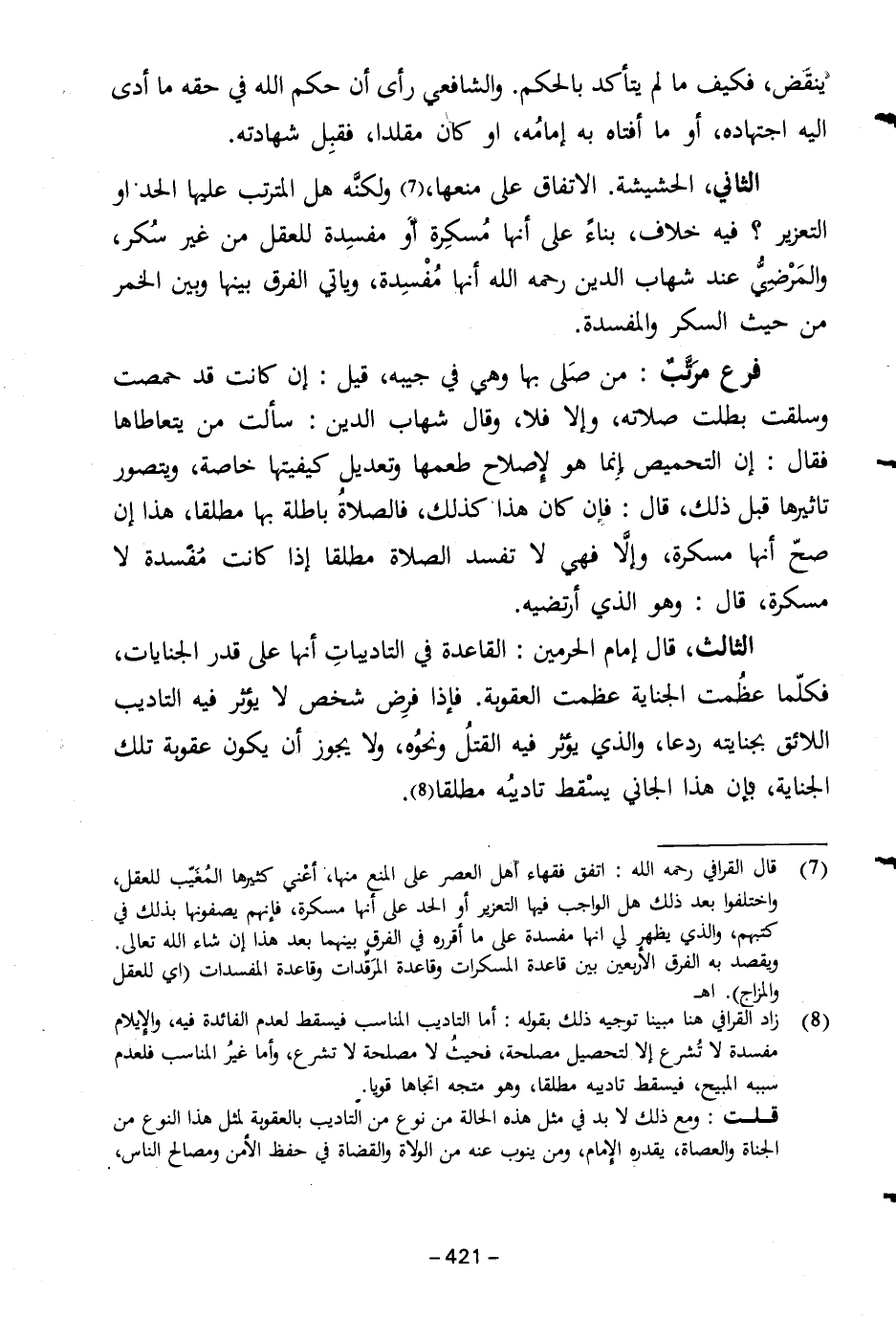 (٧) قال القرافي رحمه الله: اتفق فقهاء أهل العصر على المنع منها، أعْنى كثيرها المُغَيّب للعقل، واختلفوا بعد ذلك هل الواجب فيها التعزيز أو الحد على أنها مسكرة، فإنهم يصفونها بذلك في كتبهم، والذي يظهر لي انها مفسدة على ما أقرره في الفرق بينهما بعد هذا إن شاء الله تعالى. ويقصد به الفرق الأربعين بين قاعدة المسكرات وقاعدة المرَقِّدات وقاعدة المفسدات (اي للعقل والمزاج). اهـ