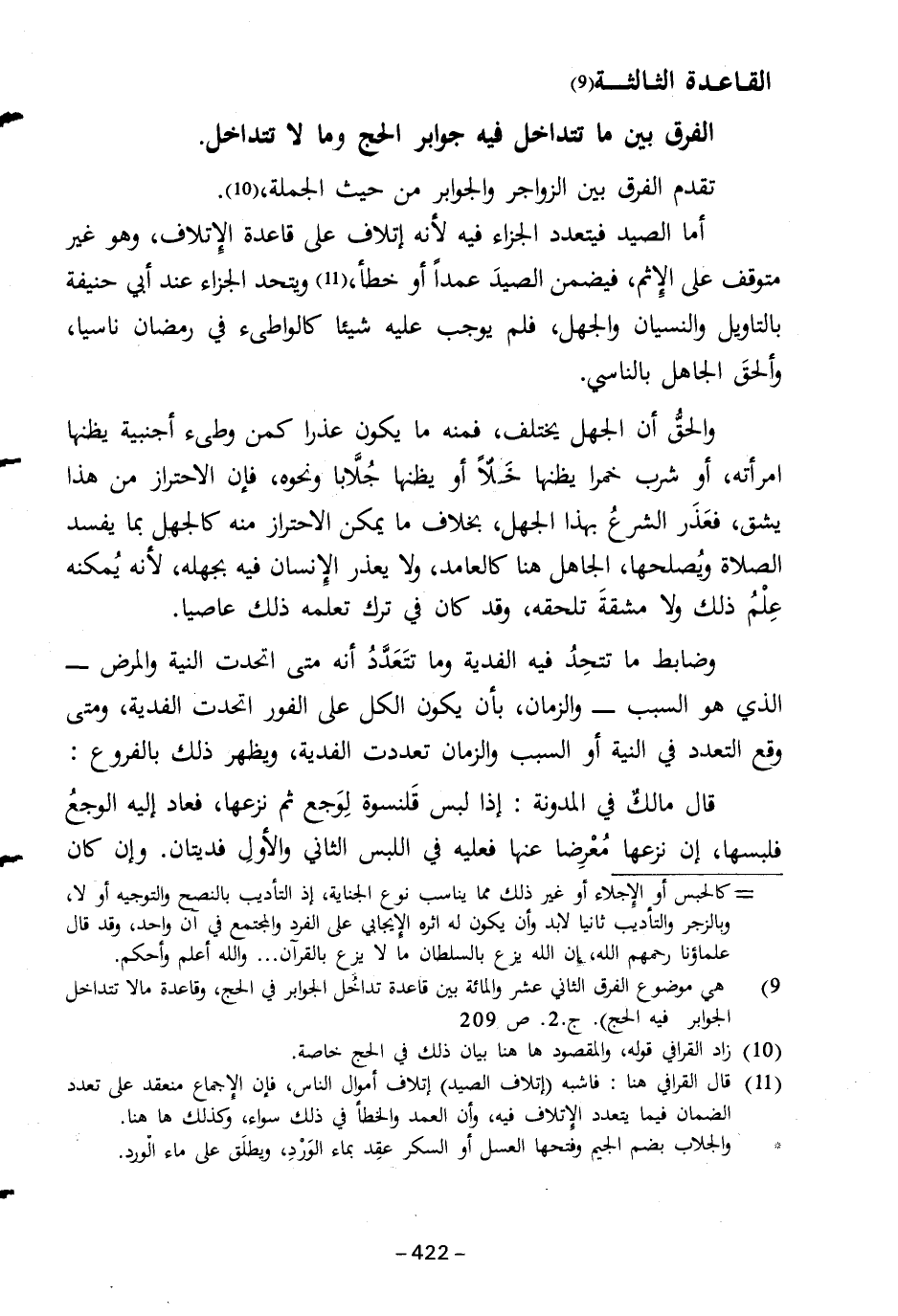 (٩) هي موضوع الفرق الثاني عشر والمائة بين قاعدة تداخُل الجوابر في الحج، وقاعدة مالا تتداخل الجوابر فيه الحج). جـ ٢. ص ٢٠٩