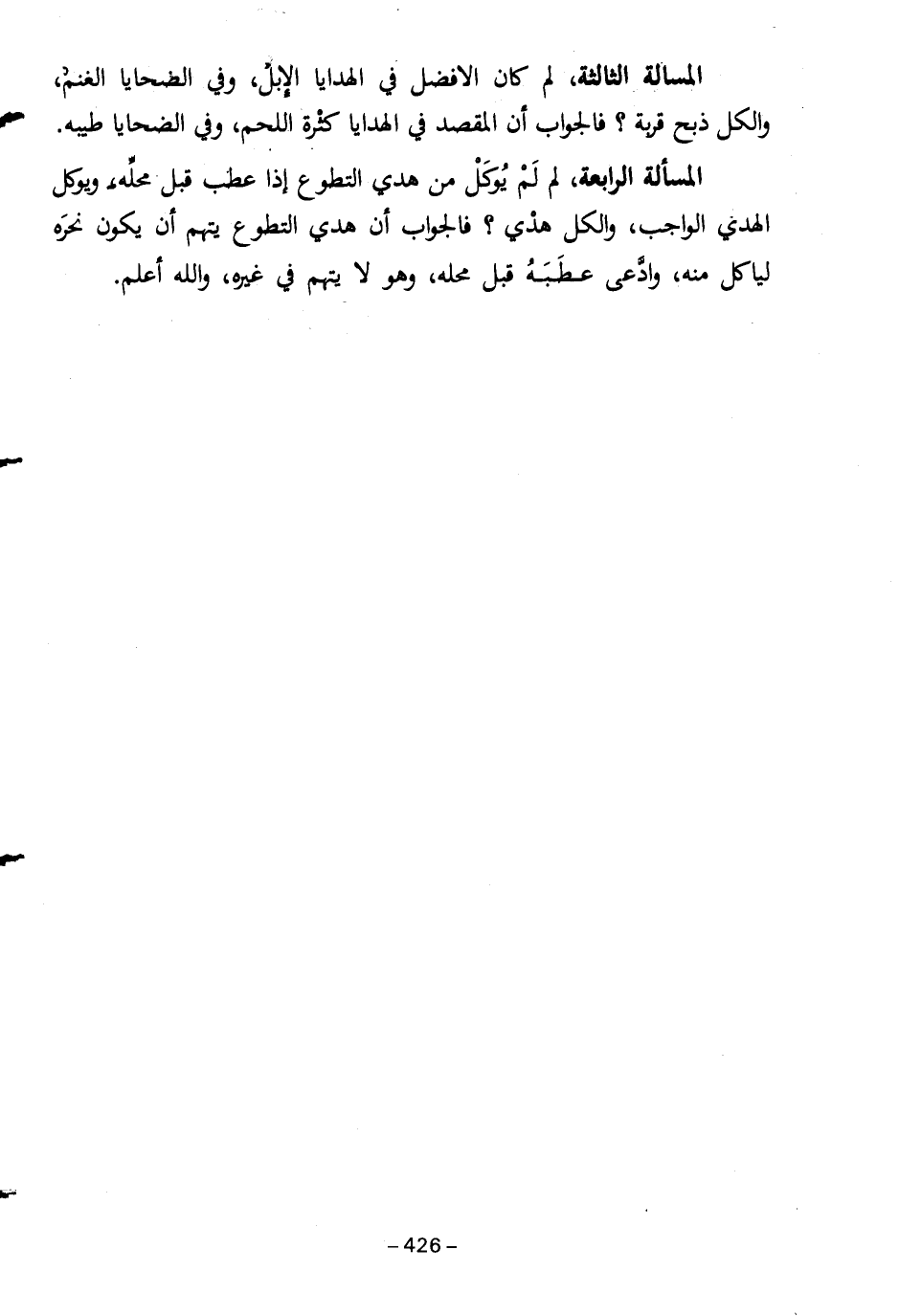المساْلة الثالثة، لم كان الافضل في الهدايا الإبل، وفي الضحايا الغنم، والكل ذبح قربة؟ فالجواب أن المقصد في الهدايا كثْرة اللحم، وفي الضحايا طيبه.