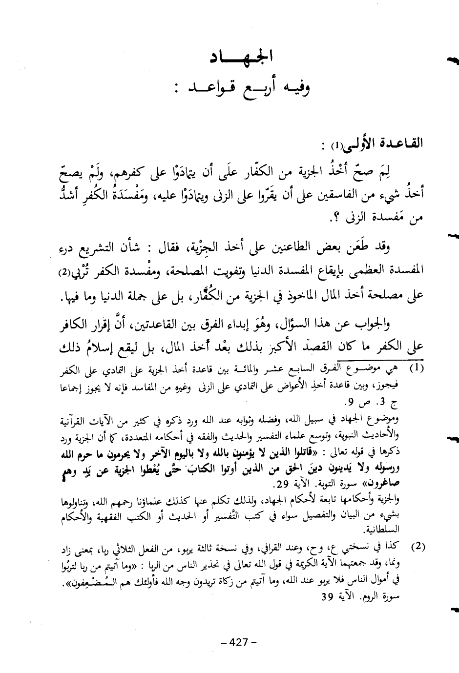 (١) هي موضوع الفرق السابع عشر والمائة بين قاعدة أخذ الجزية على التمادي على الكفر فيجوز، وبين قاعدة أخذِ الأعواض على التمادي على الزنى وغيره من المفاسد فإنه لا يجوز إجماعا جـ ٣. ص ٩.
