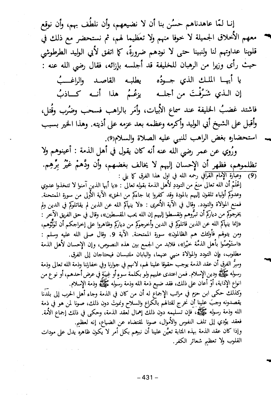 إنا لمّا عاهدناهم حسُن بنا أن لا نضيعهم، وأن نلطُف بهم، وأن نوقع معهم الأخلاق الجميلة لا خوفا منهم ولا تعظيما لهم، ثم نستحضر مع ذلك في قلوبنا عداوتهم لنا ولنبينا حتى لا نودهم ضرورةً، كما اتفق لأبي الوليد الطرطوشي حيث رأى وزيرا من الرهبان للخليفة قد أجلسه بإزائه، فقال رضي الله عنه: