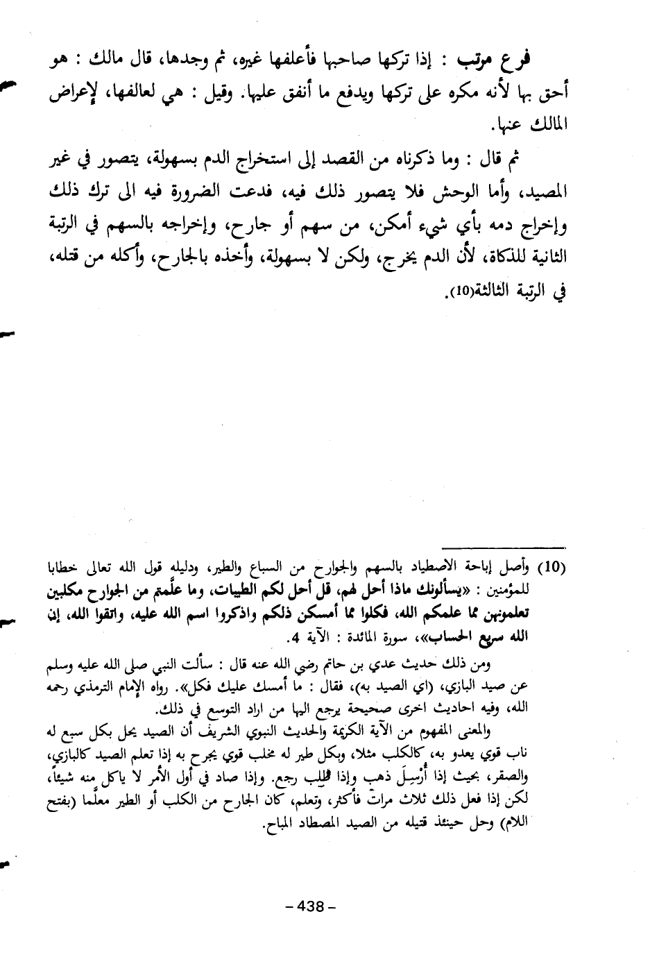 ثم قال: وما ذكرناه من القصد إلى استخراج الدم بسهولة، يتصور في غير الصيد، وأما الوحش فلا يتصور ذلك فيه، فدعت الضرورة فيه إلى ترك ذلك وإخراج دمه بأي شيء أمكن، من سهم أو جارح، وإخراجه بالسهم في الرتبة الثانية للذكاة، لأن الدم يخرج، لكن لا بسهولة، وأخذه بالجارح، وأكله من قتله، في الرتبة الثالثة (١٠).