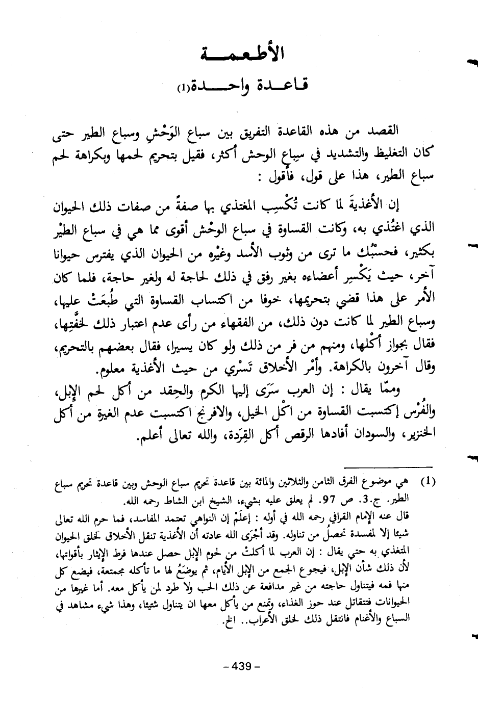 (١) هي موضوع الفرق الثامن والثلاثين والماثة بين قاعدة تحريم سباع الوحش وبين قاعدة تحريم سباع الطير. جـ ٣. ص ٩٧. لم يعلق عليه بشيء، الشيخ ابن الشاط رحمه الله.