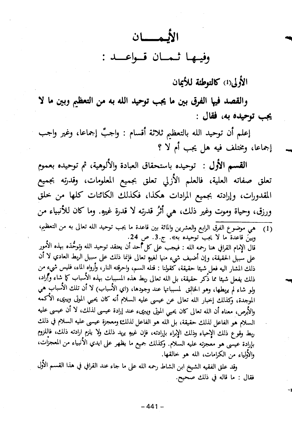 (١) هي موضوع الفرق الرابع والعشرين والمائة بين قاعدة ما يجب توحيد الله تعالى به من التعظيم، وبينَ قاعدة ما لا يجب توجده به". جـ ٣. ص ٢٤.