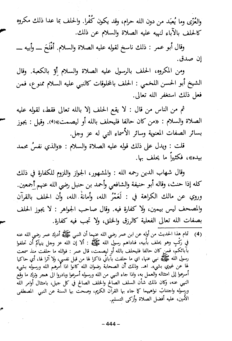 ومن المكروه، الحلف بالرسول عليه الصلاة والسلام أوْ بالكعبة. وقال الشيخ أبو الحسن اللخمي: الحلف بالخلوقات كالنبى عليه السلام ممنوع، فمن فعل ذلك استغفر الله تعالى.