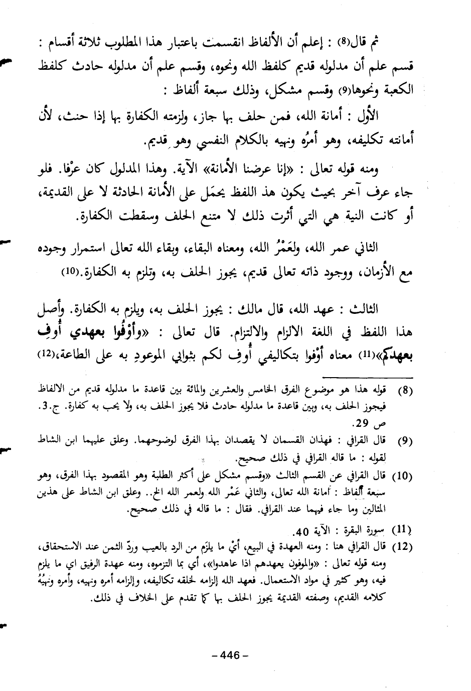 (١٢) قال القرافي هنا: ومنه العهدة في البيع، أيْ ما يلزَم من الرد بالعيب وردّ الثمن عند الاستحقاق، ومنه قوله تعالى: "والوفون يعهدهم إذا عاهدوا"، أي بما التزموه، ومنه عهدة الرفيق اي ما يلزم فيه، وهو كثير في مواد الاستعمال. فعهد الله الزامه لخلقه تكاليفه، والزامه أمره ونهيه، وأمره ونهيُهُ كلامه القديم، وصفته القديمة يجوز الحلف بها كما تقدم على الخلاف في ذلك.