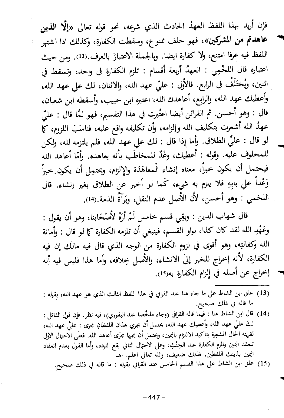 (١٣) علق ابن الشاط على ما جاء هنا عند القرافي في هذا اللفظ الثالث الذي هو عهد الله، بِقوله: ما قاله في ذلك صحيح.