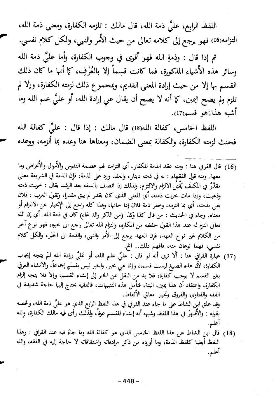(١٨) قال ابن الشاط عن هذا اللفظ الخامس الذي هو كفالة الله وما جاءَ فيه عند القرافي: وهذا اللفظ أيضا كلفظ الذمة، وما أوره من ذكر مرادفاته واشتقاقاته لا حاجة إليه في الفقه، والله أعلم.