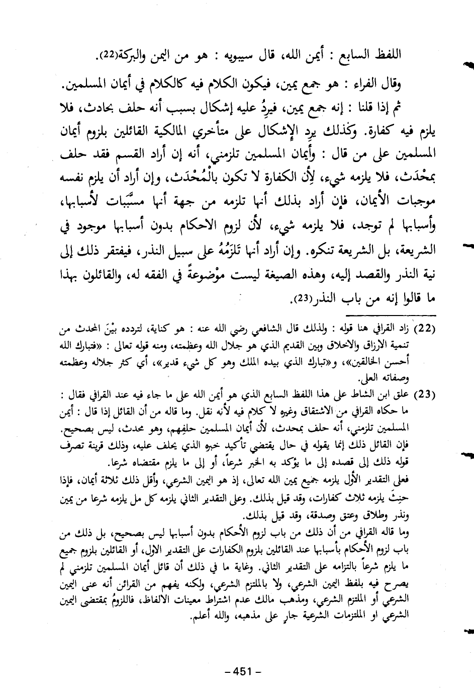 (٢٣) علق ابن الشاط على هذا اللفظ السابع الذي هو أيمن الله على ما جاء فيه عند القرافي فقال: ما حكاه القرافي من الاشتقاق وغيره لا كلام فيه لأنه نقل. وما قاله من أن القائل إذا قال: أيمن المسلمين تلزمني، أنه حلف بمحدث، لأن أيمان المسلمين حلفِهم، وهو محدث، ليس بصحيح. فإن القائل ذلك إنما يقوله في حال يقتضى تأكيد خبره الذي يحلف عليه، وذلك قرينة تصرف قوله ذلك إلى قصده إلى ما يؤكد به الخبر شرعاً، أو إلى ما يلزم مقتضاه شرعا.