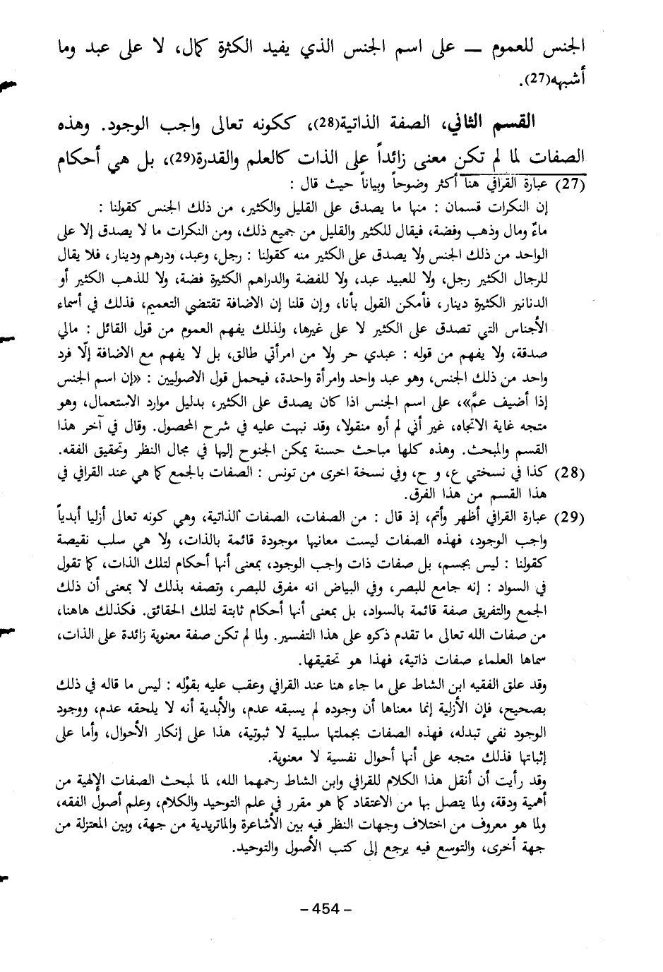 (٢٨) كذا في نسختي ع، وح، وفي نسخة اخرى من تونس: الصفات بالجمع كما هي عند القرافي في هذا القسم من هذا الفرق.