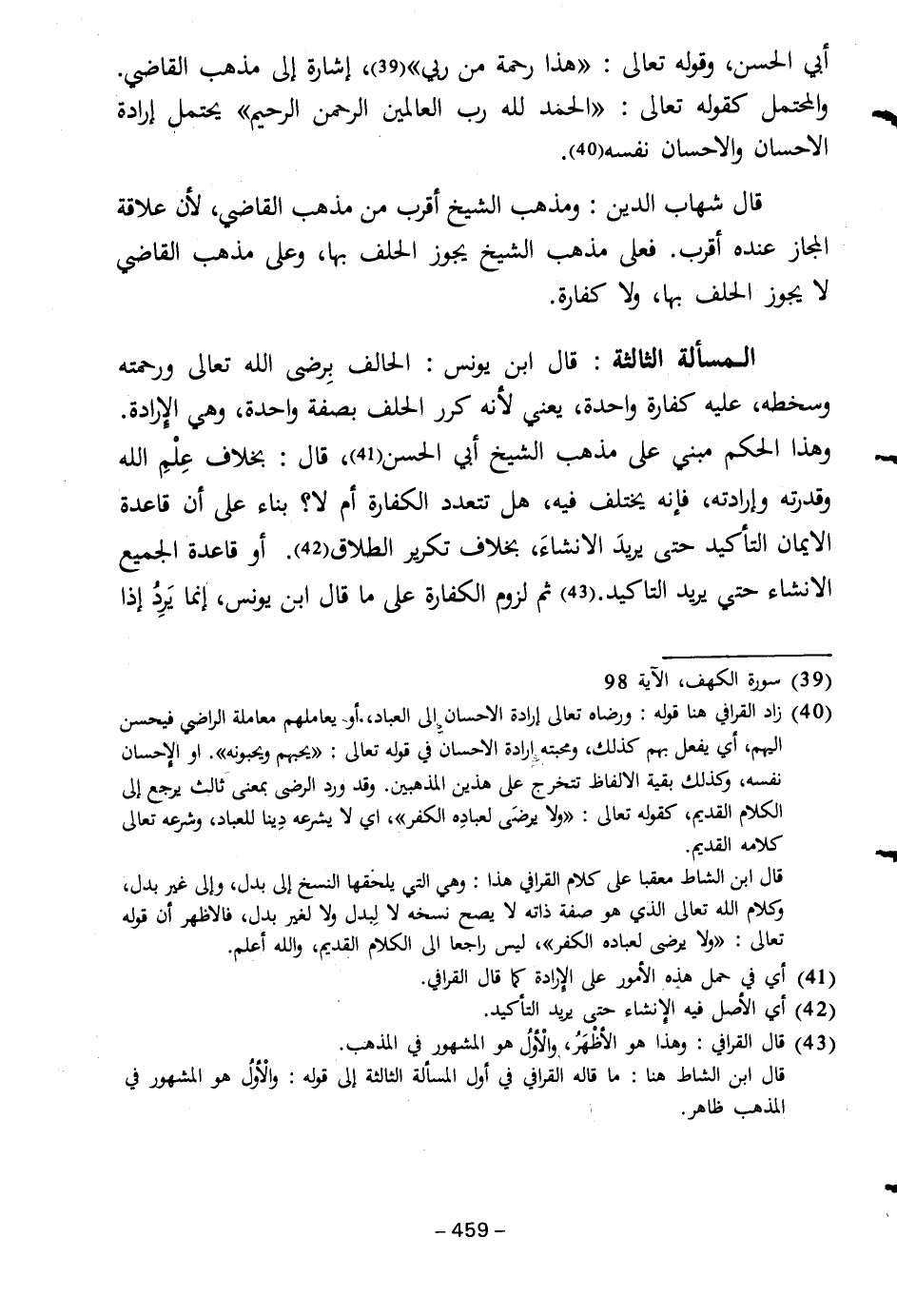 المسألة الثالثة: قال ابن يونس: الحالف بِرضي الله تعالى ورحمته وسخطه، عليه كفارة واحدة، يعني لأنه كرر الحلف بصفة واحدة، وهي الإرادة. وهذا الحكم مبني على مذهب الشيخ أبي الحسن (٤١)، قال: بخلاف عِلْمِ الله وقدرته وإرادته، فإنه يختلف فيه، هل تتعدد الكفارة أم لا؟ بناء على أن قاعدة الايمان التأكيد حتى يريدَ الانشاءَ، بخلاف تكرير الطلاق (٤٢). أو قاعدة الجميع الانشاء حتي يريد التاكيد. (٤٣) ثم لزوم الكفارة على ما قال ابن يونس، إنما يَرِدُ إذا