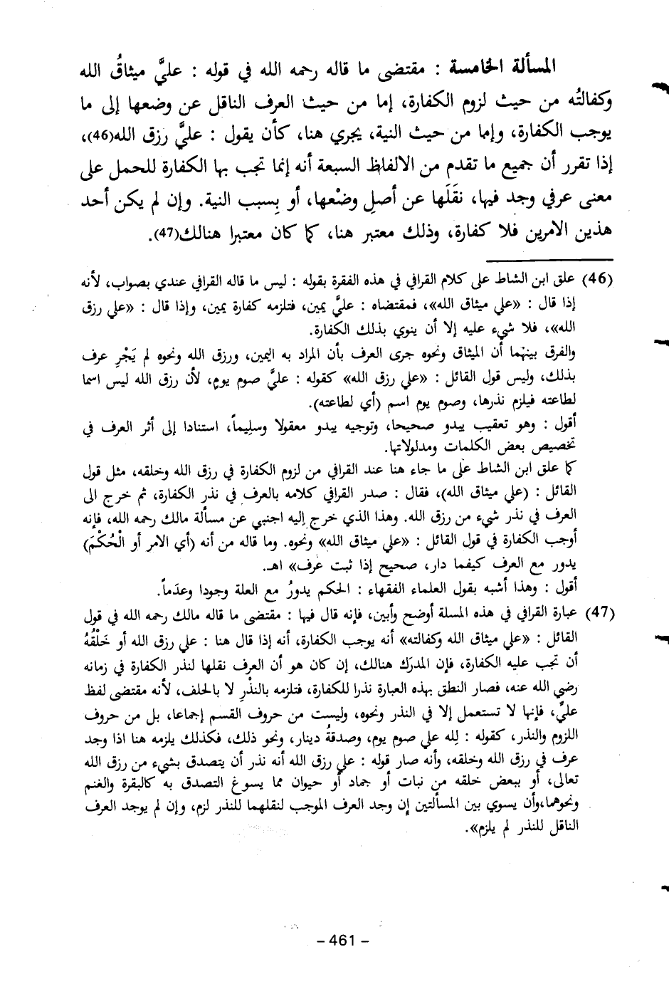 (٤٧) عبارة القرافي في هذه المسلة أوضح وأبين، فإنه قال فيها: مقتضى ما قاله مالك رحمه الله في قول القائل: "علي ميثاق الله وكفالته" أنه يوجب الكفارة، أنه إذا قال هنا: علي رزق الله أو خَلْقُهُ أن تجب عليه الكفارة، فإن المدرَك هنالك، إن كان هو أن العرف نقلها لنذر الكفارة في زمانه رضي الله عنه، فصار النطق بهذه العبارة نذرا للكفارة، فتلزمه بالنذْرِ لا بالحلف، لأنه مقتضى لفظ عليِّ، فإنها لا تستعمل إلا في النذر ونحوه، وليست من حروف القسم إجماعا، بل من حروف اللزوم والنذر، كقوله: لِله علي صوم يوم، وصدقةُ دينار، ونحو ذلك، فكذلك يلزمه هنا إذا وجد عرف في رزق الله وخلقه، وأنه صار قوله: على رزق الله أنه نذر أن يتصدق بشيء من رزق الله تعالى، أو ببعض خلقه من نبات أو جماد او حيوان مما يسوغ التصدق به كالبقرة والغنم ونحوهما، وأن يسوي بين المسألتين إن وجد العرف الموجب لنقلهما للنذر لزم، وإن لم يوجد العرف الناقل للنذر لم يلزم".
