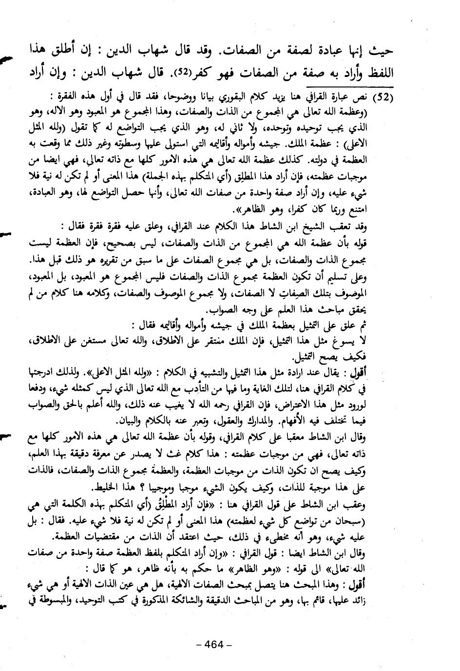 (٥٢) نص عبارة القرافي هنا يزيد كلام البقوري بيانا ووضوحا، فقد قال في أول هذه الفقرة: (وعظمة الله تعالى هي المجموع من الذات والصفات، وهذا المجموع هو المعبود وهو الاله، وهو الذي يجب توحيده وتوحده، ولا ثاني له، وهو الذي يجب التواضع له كما تقول (ولله المثل الاعلى): عظمة الملك. جيشه وأمواله وأقاليمه التي استولى عليها وسطوته وغير ذلك مما وقعت به العظمة في دولته. كذلك عظمة الله تعالى هي هذه الامور كلها مع ذاته تعالي، فهي ايضا من موجبات عظمته، فإن أراد هذا المطلِق (أي المتكلم بهذه الجملة) هذا المعنى أو لم تكن له نية فلا شيء عليه، وإن أراد صفة واحدة من صفات الله تعالى، وأنها حصل التواضع لها، وهو العبادة، امتنع وربما كان كفرا، وهو الظاهر".
