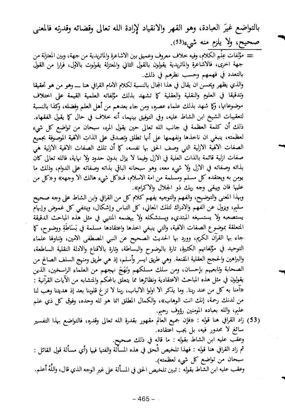 وبهذا المعنى والتوضيح، والفهم والتوجيه يفهم كلام كل من القرافي وابن الشاط على وجه صحيح سليم، ويزول عن الفهم والادراك لتلك المعاني، كل التباس وإشكال، وينتفي كل غموض وإبهام يستصعبه ولا يستسيغه المبتديء ويستشكله ولا يهضمه المنتهي في مثل هذه المباحث الدقيقة المتعلقة بموضوع الصفات الالهية، والتي ينبغي اخذها واعتقادها مسلمة في بَسَاطَةِ ووضوح، كما جاء بها القرآن الكريم، وورد بها الحديث الصحيح عن النبي المصطفى الامين، وتناولها علماء التوحيد في مؤلفاتهم الكثيرة، تارة بالوضوح والبساطة، وتارة بالاقناع والادلة النقلية الساطعة، والبراهين والحجج العقلية المقنعة. وهي طريق ايسر وأسلم، إذ هي طريق ومنهج السلف الصالح من الصحابة وتابعيهم بإحسان، ومن سلك مسلكهم ونَهَجَ نهجهم من العلماء الراسخين، الذين يقولون في مثل هذه المباحث الاعتقادية ونظائرها مما يتعلق بالمحكم والمتشابه من الآيات القرآنية: "آمنا به كل من عند ربنا. وما يذكر الا اولوا الالباب، ربنا لا تزغ قلوبنا بعد إذ هديتنا وهب لنا من لدنك رحمة، إنك انت الوهاب"، والكمال المطلق إنما هو لله وحده، وفوق كل ذي علم عليم، والله بعباده المومنين رؤوف رحيم.