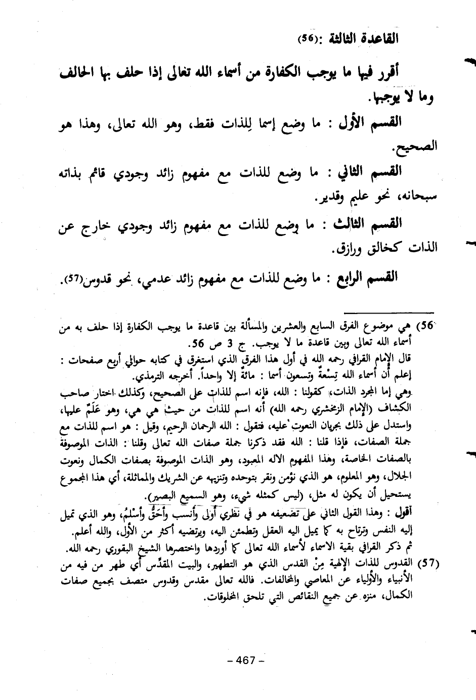 (٥٦) هي موضوع الفرق السابع والعشرين والمسألة بين قاعدة ما يوجب الكفارة إذا حلف به من أسماء الله تعالى وبين قاعدة ما لا يوجب. جـ ٣ ص ٥٦.