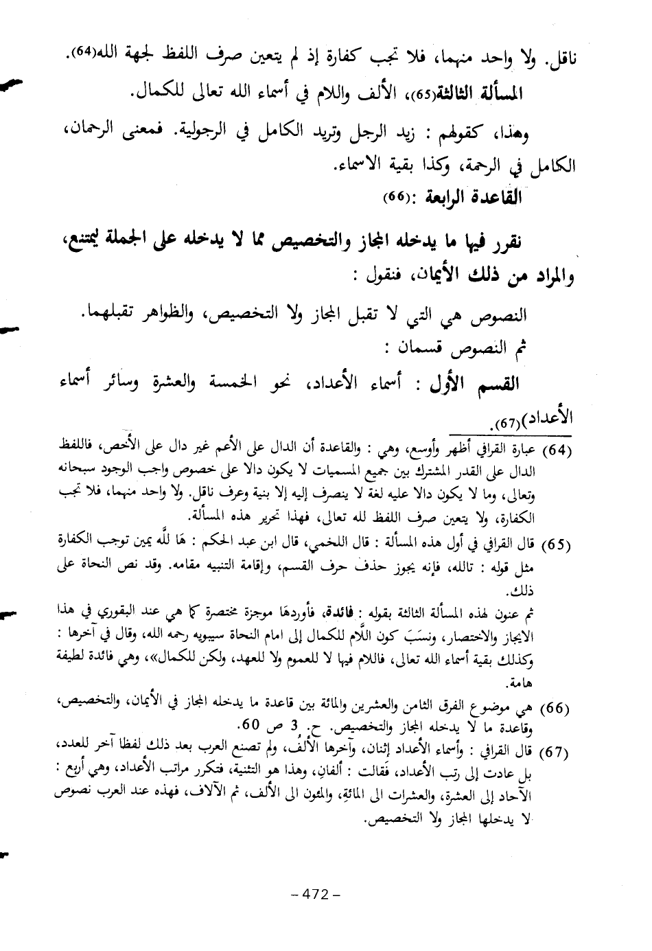 (٦٦) هي موضوع الفرق الثامن والعشرين والمائة بين قاعدة ما يدخله المجاز في الأيمان، والتخصيص، وقاعدة ما لا يدخله المجاز والتخصيص. ح. ٣ ص ٦٠.