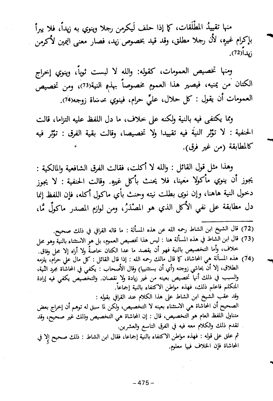 (٧٣) قال ابن الشاط في هذه المسألة هنا: ليس هذا تخصيص العموم، بل هو الاستثناء بالنية وهو محل خلاف، وأما التخصيص بالنية فهو أن يقصد ما عدا الكتان خاصةً ولا أراه إلا محل وفاق.