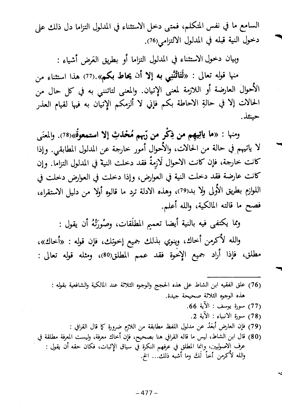 ومنها: "ما ياتِيهِم من ذِكْر من رّبهم مُحْدثِ إلا استمعوةُ" (٧٨). والمعنَى لا ياتيهم في حالة من الحالات، والأحوال أمور خارجة عن المدلول المطابقي. وإذا كانت خارجة، فإن كانت الاحوال لَازِمةً فقد دخلت النية في المدلول التزاما. وإن كانت عارضة فقد دخلت النية في العوارض، وإذا دخلت في العوارض دخلت في اللوازم بطريق الأولى ولا بد (٧٩)، وهذه الادلة ترد ما قالوه أولا من دليل الاستقراء، فصح ما قالته المالكية، والله أعلم.