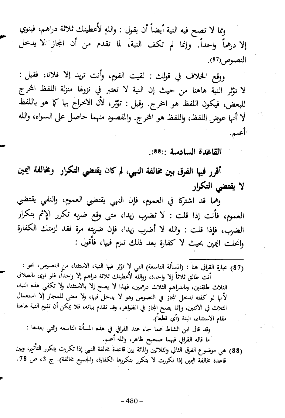 (٨٨) هي موضوع الفرق الثاني والثلاثين والمائة بين قاعدة مخالفة النهي إذا تكررت يتكرر التأثيم، وبين قاعدة مخالفة اليمين إذا تكررت لا يتكرر بتكررها الكفارة، والجميع مخالفة). جـ ٣، ص ٧٨.