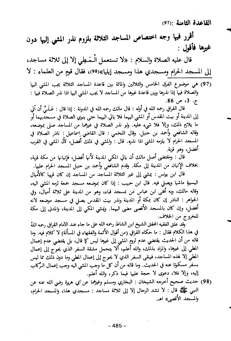 (٩٧) هي موضوع الفرق الخامس والثلاثين والمائة بين قاعدة المساجد الثلاثة يجب المشي اليها والصلاة فيها إذا نذرها وبين قاعدة غيرها من المساجد لا يجب المشي اليها إذا نذر الصلاة فيها: جـ ٣، ص ٨٦.