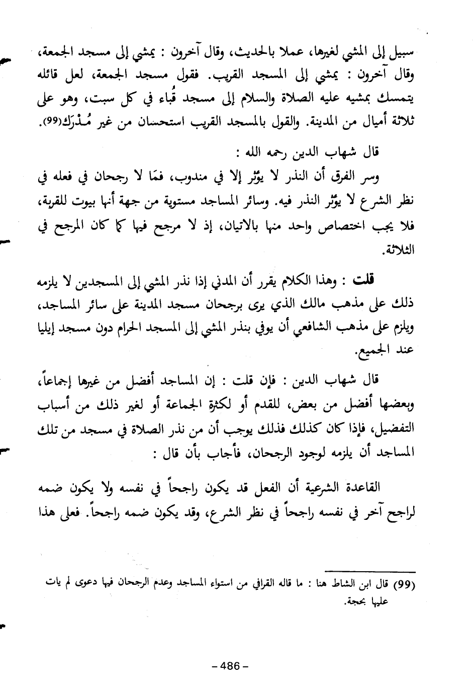 (٩٩) قال ابن الشاط هنا: ما قاله القرافي من استواء المساجد وعدم الرجحان فيها دعوى لم يات عليها بحجة.