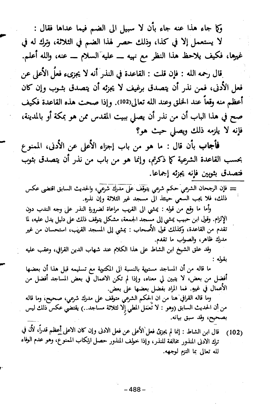 قال رحمه الله: فإن قلت: القاعدة في النذر أنه لا يجزئ فعلُ الأعلى عن فعل الأدنى، فمن نذر أن يتصدق برغيف لا يجزئه أن يتصدق بثوب وإن كان أعظم منه وقعاً عند الخلق وعند الله تعالى (١٠٢). وإذا صحت هذه القاعدة فكيف صح في هذا الباب أن من نذر أن يصلي ببيت المقدس ممن هو بمكة أو بالمدينة، فإنه لا يلزمه ذلك ويصلي حيث هو؟