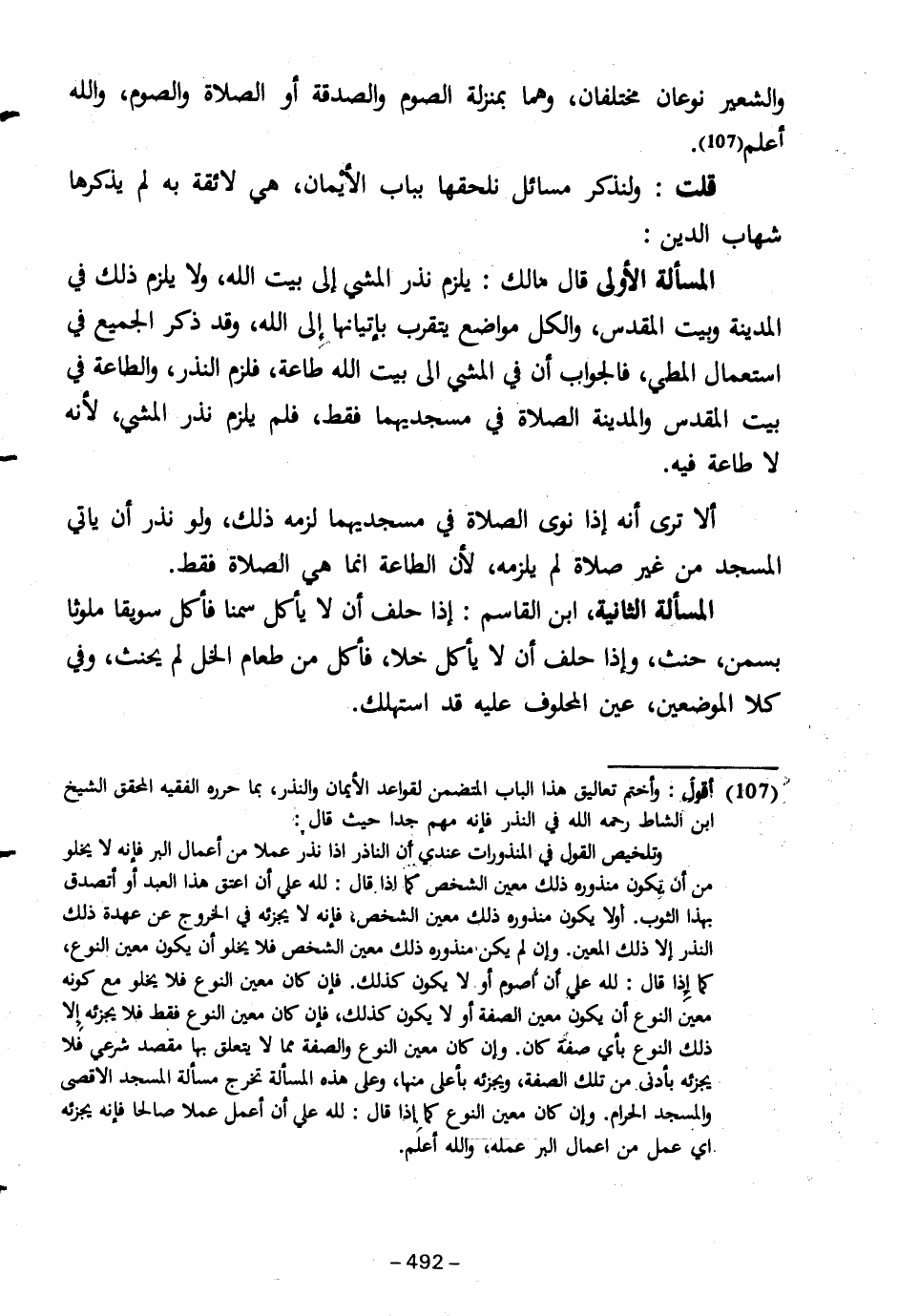 المسألة الأولى قال مالك: يلزم نذر المشي إلى بيت الله، ولا يلزم ذلك في المدينة وبيت المقدس، والكل مواضع يتقرب بإتيانها إلى الله، وقد ذكر الجميع في استعمال المطي، فالجواب أن في المشي إلى بيت الله طاعة، فلزم النذر، والطاعة في بيت المقدس والمدينة الصلاة في مسجديهما فقط، فلم يلزم نذر المشي، لأنه لا طاعة فيه.