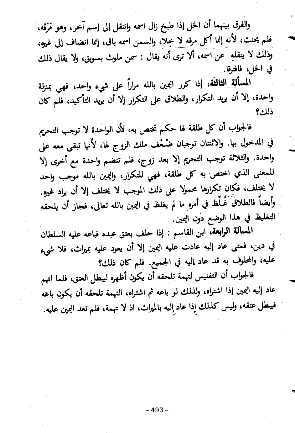 فالجواب أن كل طلقة لها حكم تختص به، لأن الواحدة لا توجب التحربم في المدخول بها. والاثنتان توجبان ضُعْف ملك الزوج لها، لأنها تبقى معه على واحدة. والثلاثة توجب التحريم إلا بعد زوج، فلم تنضم واحدة مع أخرى إلا للمعنى الذي اختص. به كل طلقة، فهي للتكرار، واليمين بالله موجب واحد لا يختلف، فكان تكرارها محمولا على ذلك الموجب لا يختلف إلا أن يراد غيره. وأيضًا فالطلاق غُلِّظ في أمره ما لم يغلظ في اليمين بالله تعالى، فجاز أن يلحقه التغليظ في هذا الوضع دون اليمين.