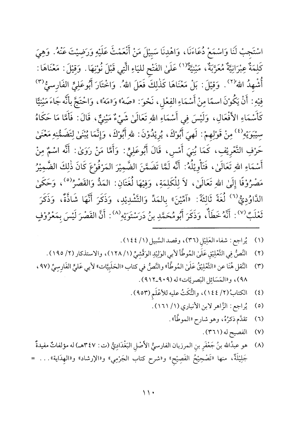 استجب لنا واسمع دعاءنا، واهدنا سبيل من أنعمت عليه ورضيت عنه. وهي كلمةٌ عبرانية معربة، مبنية على الفتح للياء التي قبل نونها. وقيل: معناها: أشهد الله. وقيل: بل معناها كذلك فعل الله. واختار أبو علي الفارسي فيه: أن يكون اسماً من أسماء الفعل، نحو: "صه" و"مه"، واحتج بأنه جاء مبنياً كأسماء الأفعال، وليس في أسماء الله تعالى شيءٌ مبنيٌ، قال: فأما ما حكاه سيبويه من قولهم: لهي أبوك، يريدون: لله أبوك، وإنما يبنى لتضمنه معنى حرف التعريف، كما بني أمس، قال أبو علي: وأما من روى: أنه اسمٌ من أسماء الله تعالى، فتأويله: أنه لما تضمن الضمير المرفوع كان ذلك الضمير مصروفاً إلى الله تعالى، لا للكلمة، وفيها لغتان: المد والقصر، وحكى الداودي لغةً ثالثةً: "آمين" بالمد والتشديد، وذكر أنها شاذةٌ، وذكر ثعلبٌ: أنه خطأٌ، وذكر أبو محمد بن درستويه: أن القصر ليس بمعروفٍ