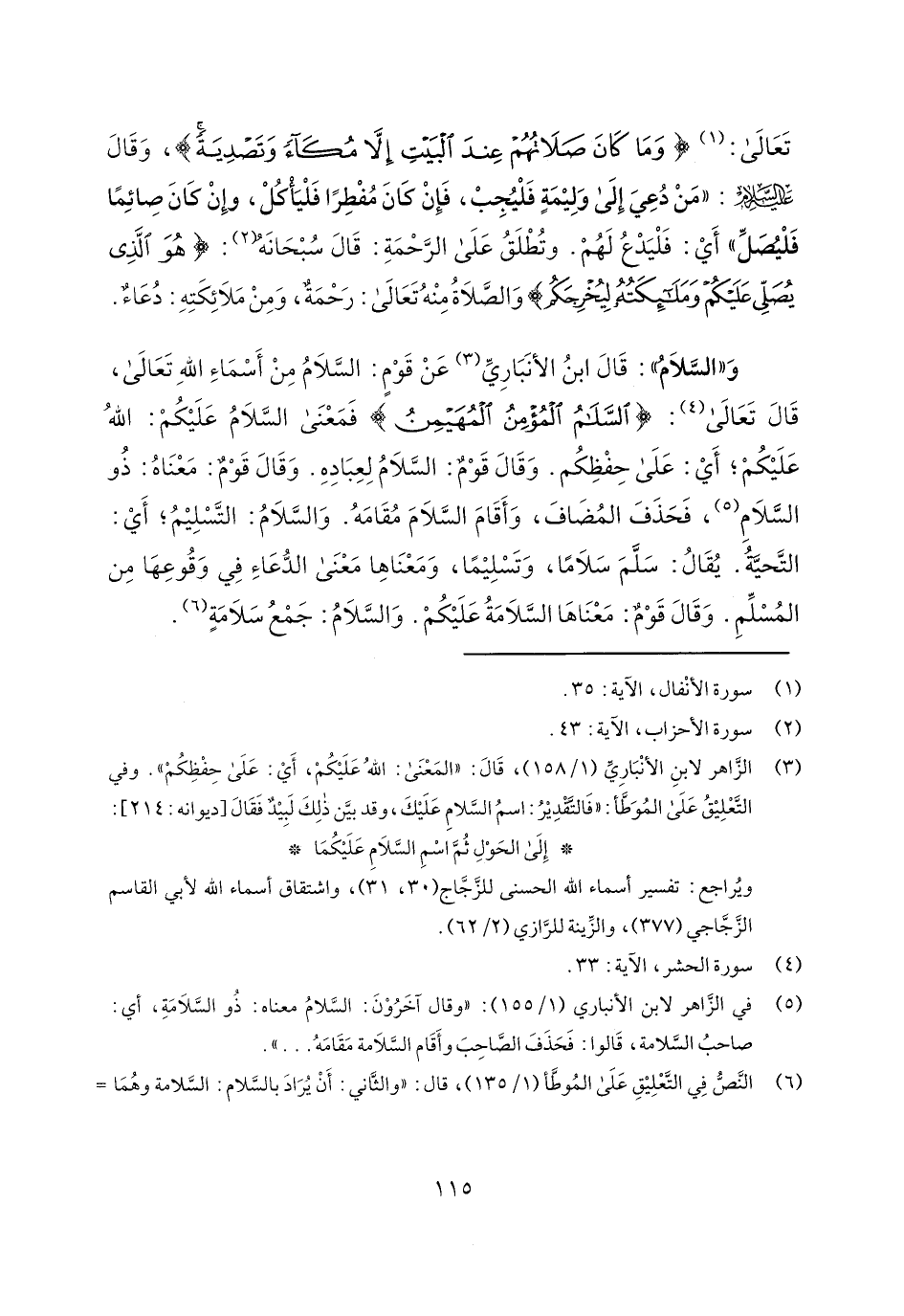 و"السلام": قال ابن الأنباري عن قوم: السلام من أسماء الله تعالى، قال تعالى: {السَّلَامُ الْمُؤْمِنُ الْمُهَيْمِنُ} فمعنى السلام عليكم: الله عليكم؛ أي: على حفظكم. وقال قومٌ: السلام لعباده. وقال قومٌ: معناه: ذو السلام، فحذف المضاف، وأقام السلام مقامه. والسلام: التسليم؛ أي: التحية. يقال: سلم سلاماً، وتسليماً، ومعناها معنى الدعاء في وقوعها من المسلم. وقال قومٌ: معناها السلامة عليكم. والسلام: جمع سلامةٍ.