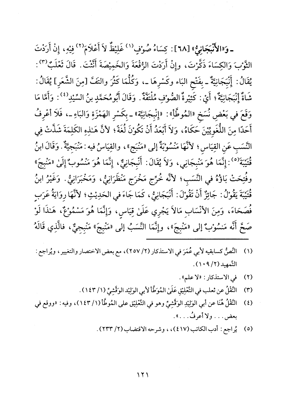 و"الأنبجاني" [68]: كساء صوف غليظ لا أعلام فيه، إن أردت الثوب والكساء ذكرت، وإن أردت الرقعة والخميصة أنثت. قال ثعلب: يقال: أنبجانية- بفتح الباء وكسرها-، وكلما كثر والتف [من الشعر] يقال: شاة إنبجانية؛ أي: كثيرة الصوف ملتفة. وقال أبو محمد بن السيد: وأما ما وقع في بعض نسخ "الموطأ": "إنبجانية"- بكسر الهمزة والباء، فلا أعرف أحداً من اللغويين حكاه، ولا أبعد أن تكون لغة؛ لأن هذه الكلمة شذت في النسب عن القياس؛ لأنها منسوبة إلى "منبج"، والقياس فيه: منبجية. وقال ابن قتيبة: إنما هو منبجاني، ولا يقال: أنبجانين إنما هو منسوب إلى "منبج" وفتحت باؤه في النسب؛ لأنه خرج مخرج منظراني، ومخبراني. وغير ابن قتيبة يقول: جائز أن تقول: أنبجاني، كما جاء في الحديث؛ لأنها رواية عرب فصحاء، ومن الأنساب ما لا يجري على قياس، وإنما هو مسموع، هذا لو صح أنه منسوب إلى "منبج"، وإنما النسب إلى "منبج" منبجي، فالذي قاله