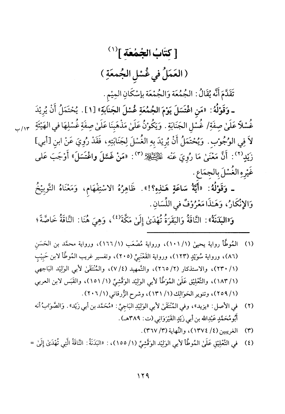 وقوله: "من اغتسل يوم الجمعة غسل الجنابة" [1]. يحتمل أن يريد غسلاً على صفة/ 13/ب غسل الجنابة. ويكون على مذهبنا على صفة غسلها في الهيئة لا في الوجوب. ويحتمل أن يريد به الغسل لجنابته، فقد روي عن ابن [أبي] زيد: أن معنى ما روي عنه عليه السلام: "من غسل واغتسل" أوجب على غيره الغسل بالجماع.