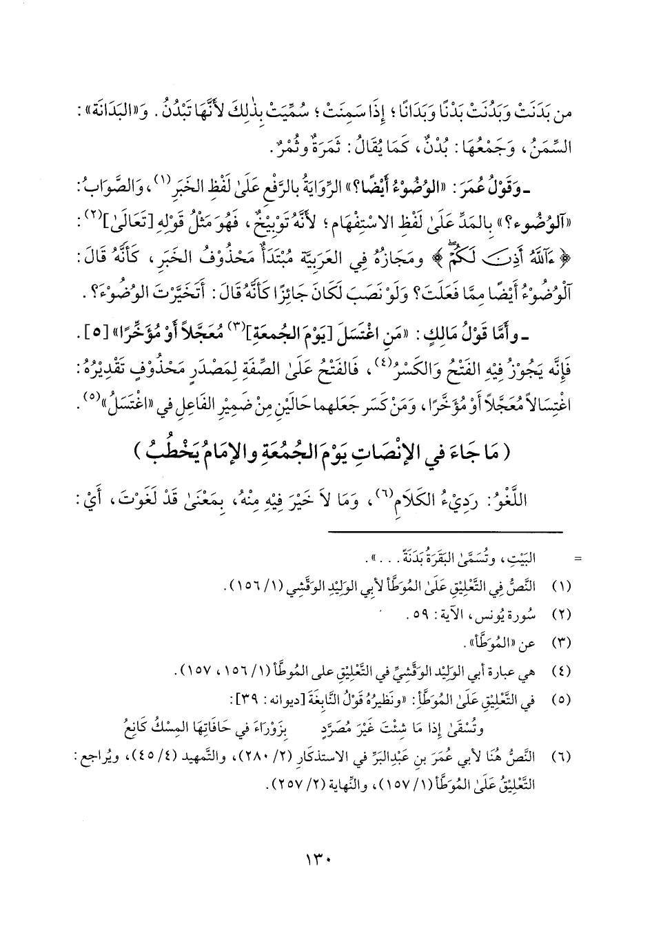 وأما قول مالك: "من اغتسل [يوم الجمعة] معجلاً أو مؤخراً" [5]. فإنه يجوز فيه الفتح والكسر، فالفتح على الصفة لمصدر محذوف تقديره: اغتسالاً معجلاً أو مؤخراً، ومن كسر جعلهما حالين من ضمير الفاعل في "اغتسل".