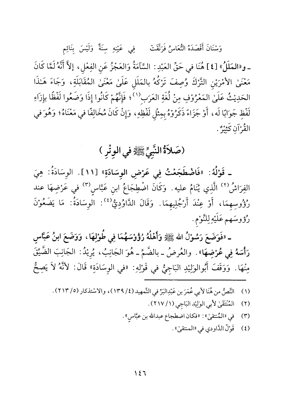 "فوضع رسول الله صلى الله عليه وسلم وأهله رؤوسهما في طولها، ووضع ابن عباس رأسه في عرضها". والعرض- بالضم- هو الجانب، يريد: الجانب الضيق منها. ووقف أبو الوليد الباجي في قوله: "في الوسادة" قال: لأنه لا يصح