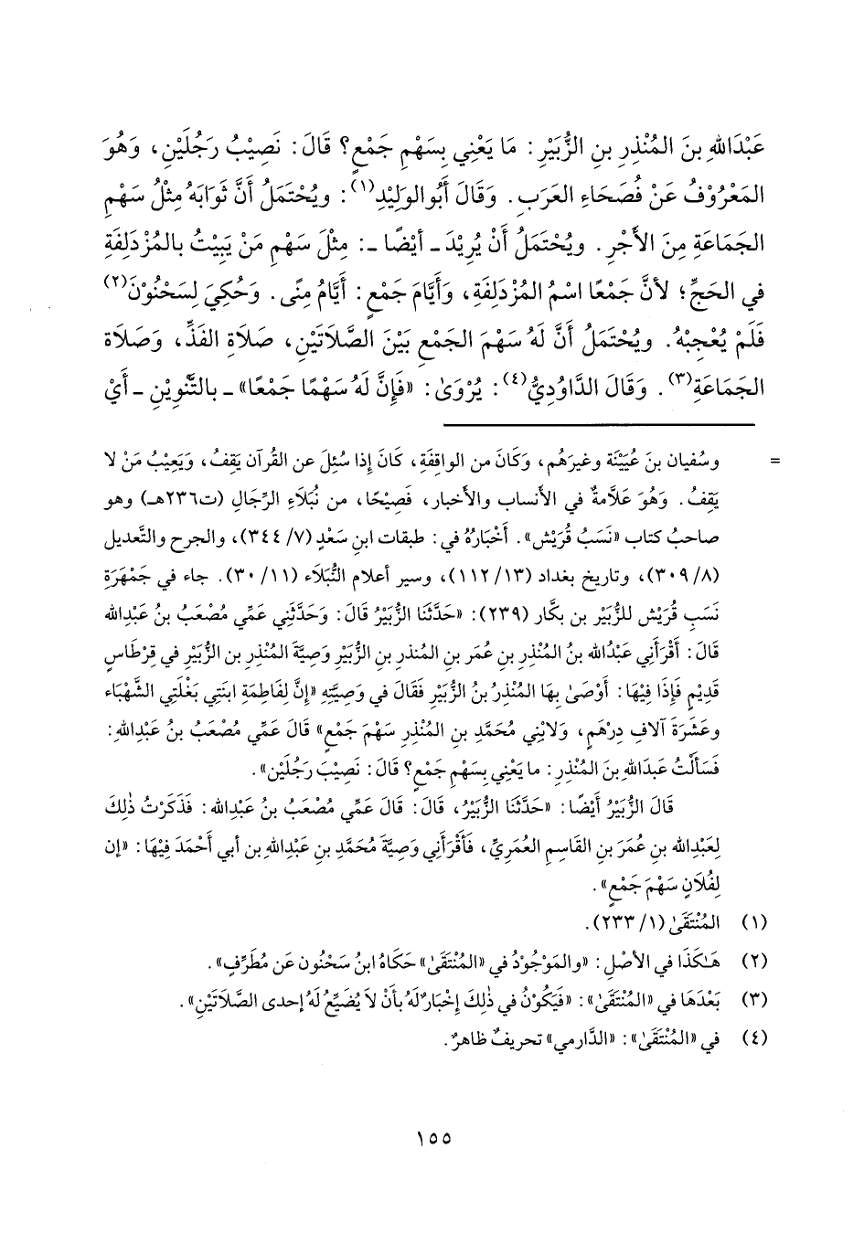 عبد الله بن المنذر بن الزبير: ما يعني بسهم جمع؟ قال: نصيب رجلين، وهو المعروف عن فصحاء العرب. وقال أبو الوليد: ويحتمل أن ثوابه مثل سهم الجماعة من الأجر. ويحتمل أن يريد- أيضاً-: مثل سهم من يبيت بالمزدلفة في الحج؛ لأن جمعا اسم المزدلفة، وأيام جمع: أيام منى. وحكي لسحنون فلم يعجبه. ويحتمل أن له سهم الجمع بين الصلاتين، صلاة الفذ، وصلاة الجماعة. وقال الداودي: يروى: "فإن له سهماً جمعاً"- بالتنوين- أي