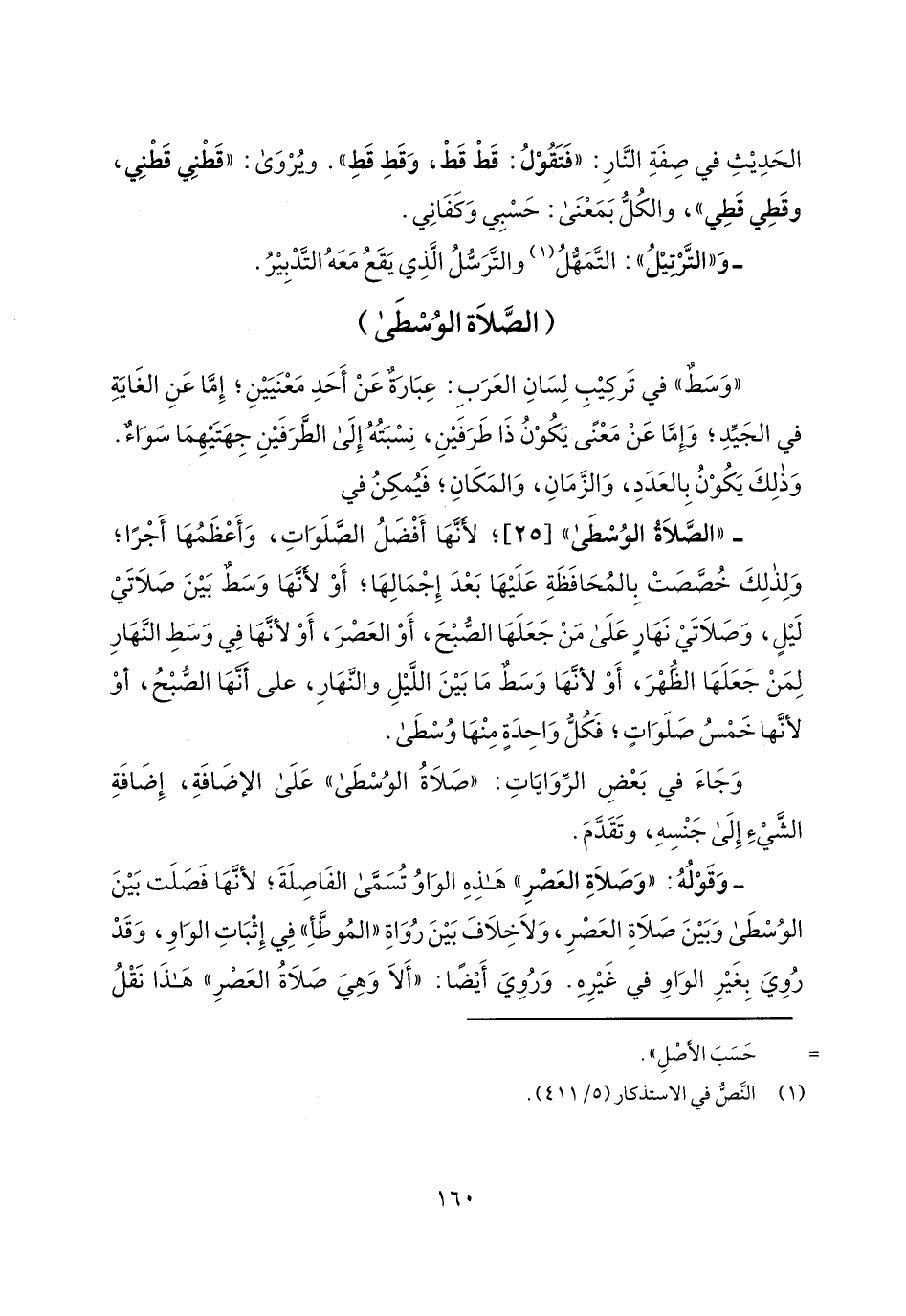 "الصلاة الوسطى" [25]؛ لأنها أفضل الصلوات، وأعظمها أجراً؛ ولذلك خصصت بالمحافظة عليها بعد إجمالها؛ أو لأنها وسط بين صلاتي ليل، وصلاتي نهار على من جعلها الصبح، أو العصر، أو لأنها في وسط النهار لمن جعلها الظهر، أو لأنها وسط ما بين الليل والنهار، على أنها الصبح، أو لأنها خمس صلوات؛ فكل واحدة منها وسطى.