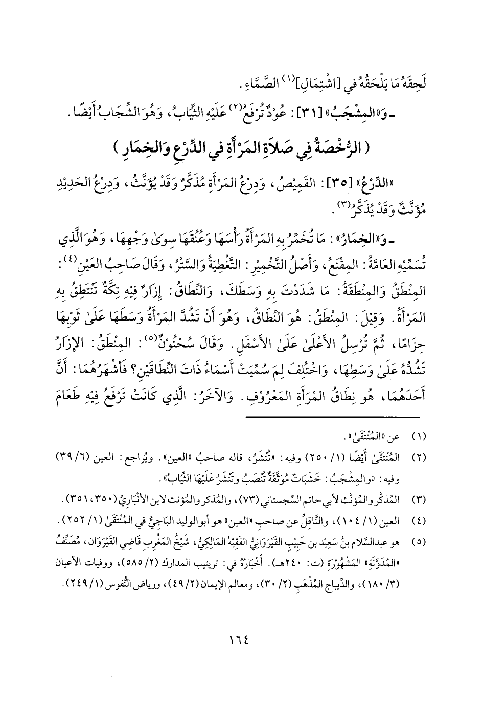 و"الخمار": ما تخمر به المرأة رأسها وعنقها سوى وجهها، وهو الذي تسميه العامة: المقنع، وأصل التخمير: التغطية والستر، وقال صاحب العين: المنطق والمنطقة: ما شددت به وسطك، والنطاق: إزار فيه تكة تنتطق به المرأة. وقيل: المنطق: هو النطاق، وهو أن تشد المرأة وسطها على ثوبها حزاماً، ثم ترسل الأعلى على الأسفل. وقال سحنون: المنطق: الإزار تشده على وسطها، واختلف لم سميت أسماء ذات النطاقين؟ فأشهرهما: أن أحدهما، هو نطاق المرأة المعروف. والآخر: الذي كانت ترفع فيه طعام