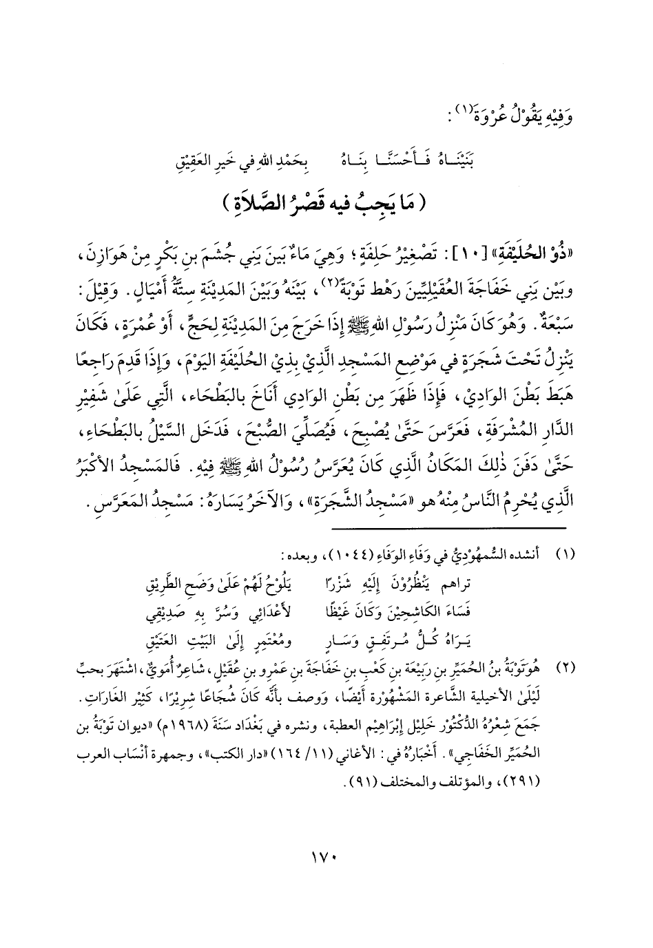 "ذو الحليفة" [10]: تصغير حلفة؛ وهي ماء بين بني جشم بن بكر من هوازن، وبين بني خفاجة العقيليين رهط توبة، بينه وبين المدينة ستة أميال. وقيل: سبعة. وهو كان منزل رسول الله صلى الله عليه وسلم إذا خرج من المدينة لحج، أو عمرة، فكان ينزل تحت شجرة في موضع المسجد الذي بذي الحليفة اليوم، وإذا قدم راجعاً هبط بطن الوادي، فإذا ظهر من بطن الوادي أناخ بالبطحاء، التي على شفير الدار المشرفة، فعرس حتى يصبح، فيصلي الصبح، فدخل السيل بالبطحاء، حتى دفن ذلك المكان الذي كان يعرس رسول الله صلى الله عليه وسلم فيه. فالمسجد الأكبر الذي يحرم الناس منه هو "مسجد الشجرة"، والآخر يساره: مسجد المعرس.