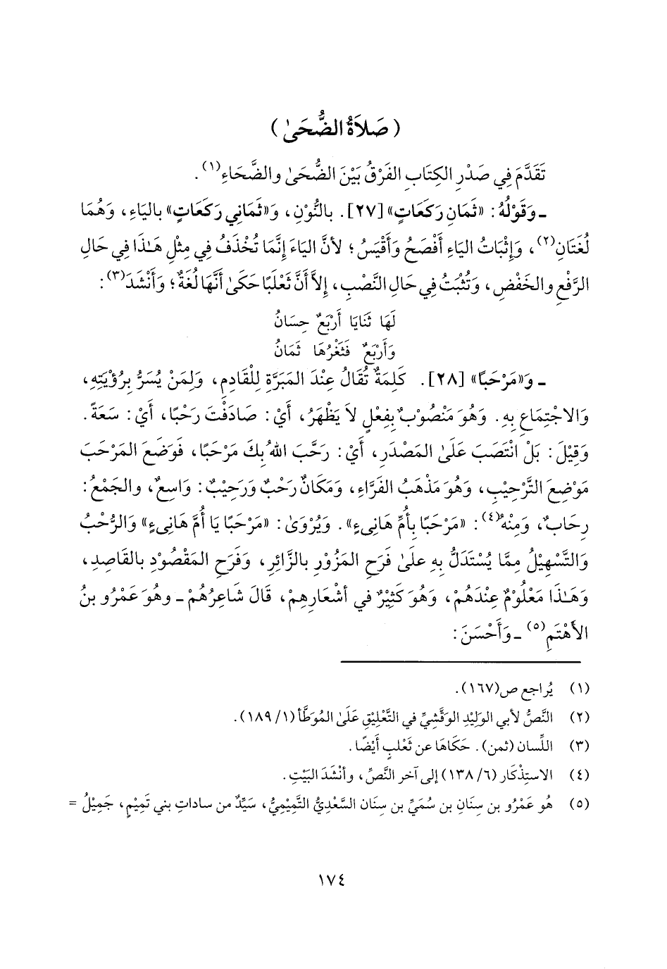 وقوله: "ثمان ركعات" [27]. بالنون، و"ثماني ركعات" بالياء، وهما لغتان، وإثبات الياء أفصح وأقيس؛ لأن الياء إنما تخذف في مثل هذا في حال الرفع والخفض، وتثبت في حال النصب، إلا أن ثعلباً حكى أنها لغة؛ وأنشد: