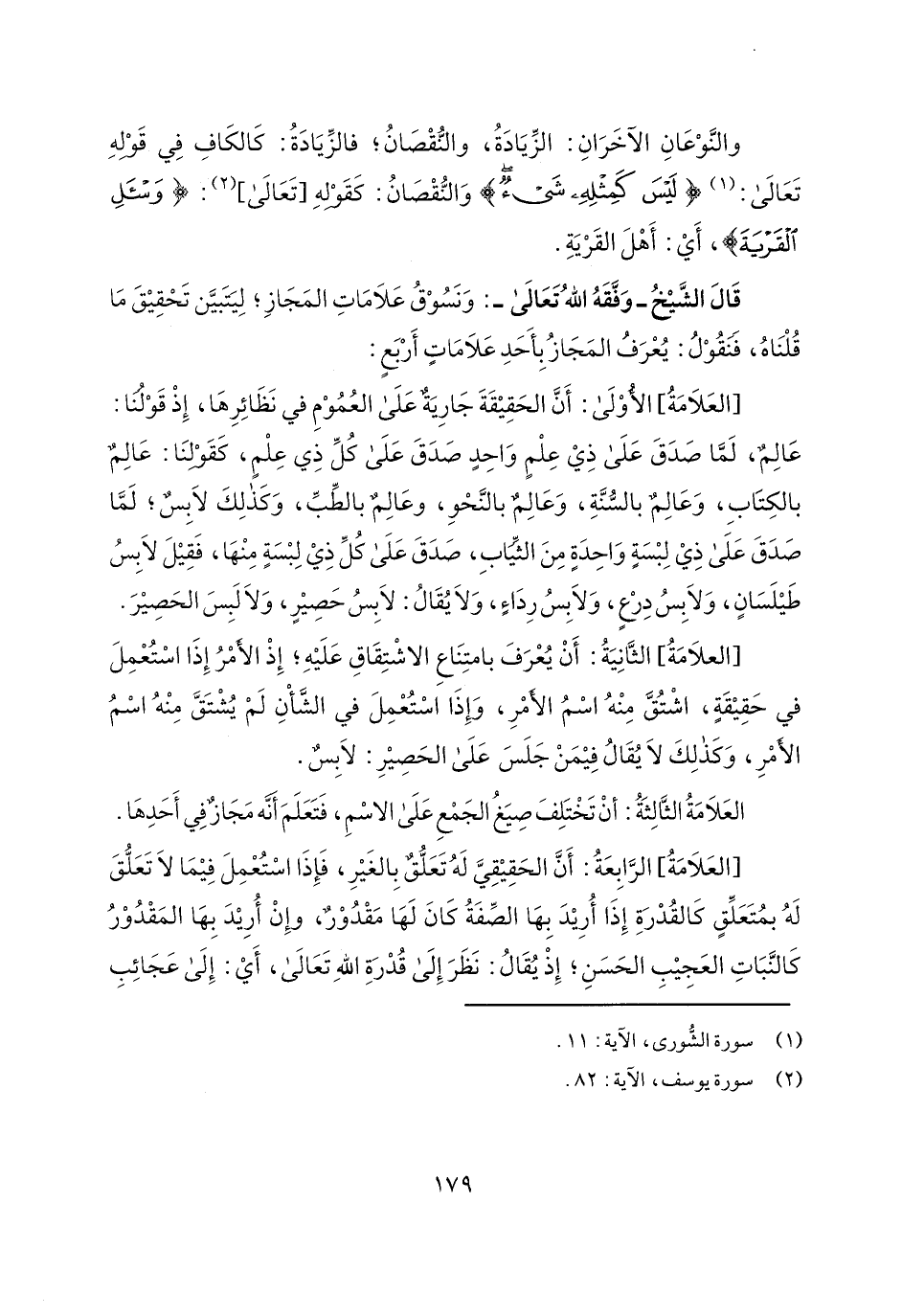قال الشيخ- وفقه الله تعالى-: ونسوق علامات المجاز؛ ليتبين تحقيق ما قلناه، فنقول: يعرف المجاز بأحد علامات أربع: