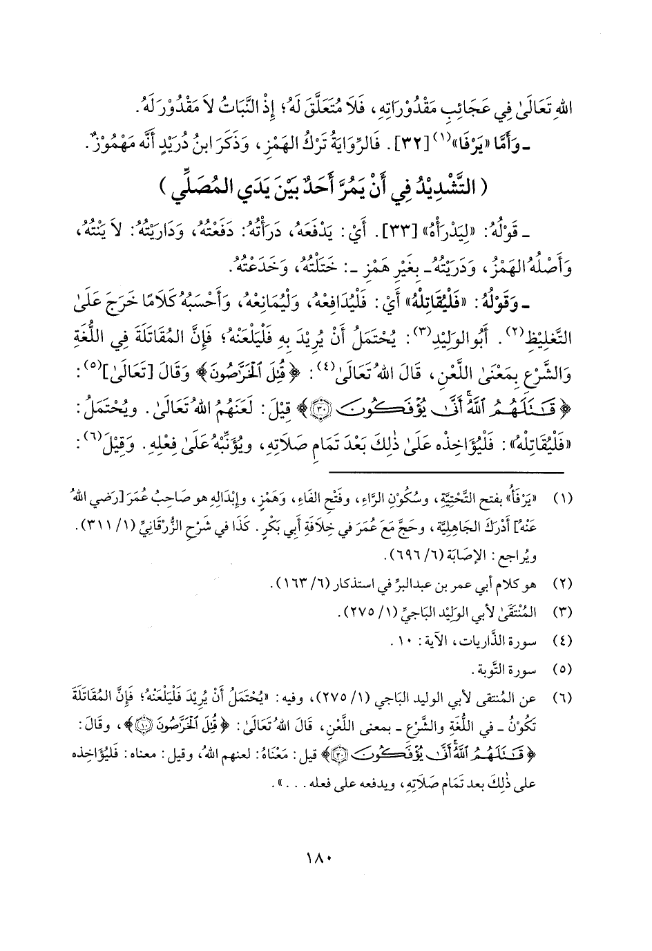 وقوله: "فليقاتله" أي: فليدافعه، وليمانعه، وأحسبه كلاماً خرج على التغليظ. أبو الوليد: يحتمل أن يريد به فليلعنه؛ فإن المقاتلة في اللغة والشرع بمعنى اللعن، قال الله تعالى: {قُتِلَ الْخَرَّاصُونَ} وقال [تعالى]: {قَاتَلَهُمْ اللَّهُ أَنَّى يُؤْفَكُونَ (30)} قيل: لعنهم الله تعالى. ويحتمل: "فليقاتله": فليؤاخذه على ذلك بعد تمام صلاته، ويؤنبه على فعله. وقيل: