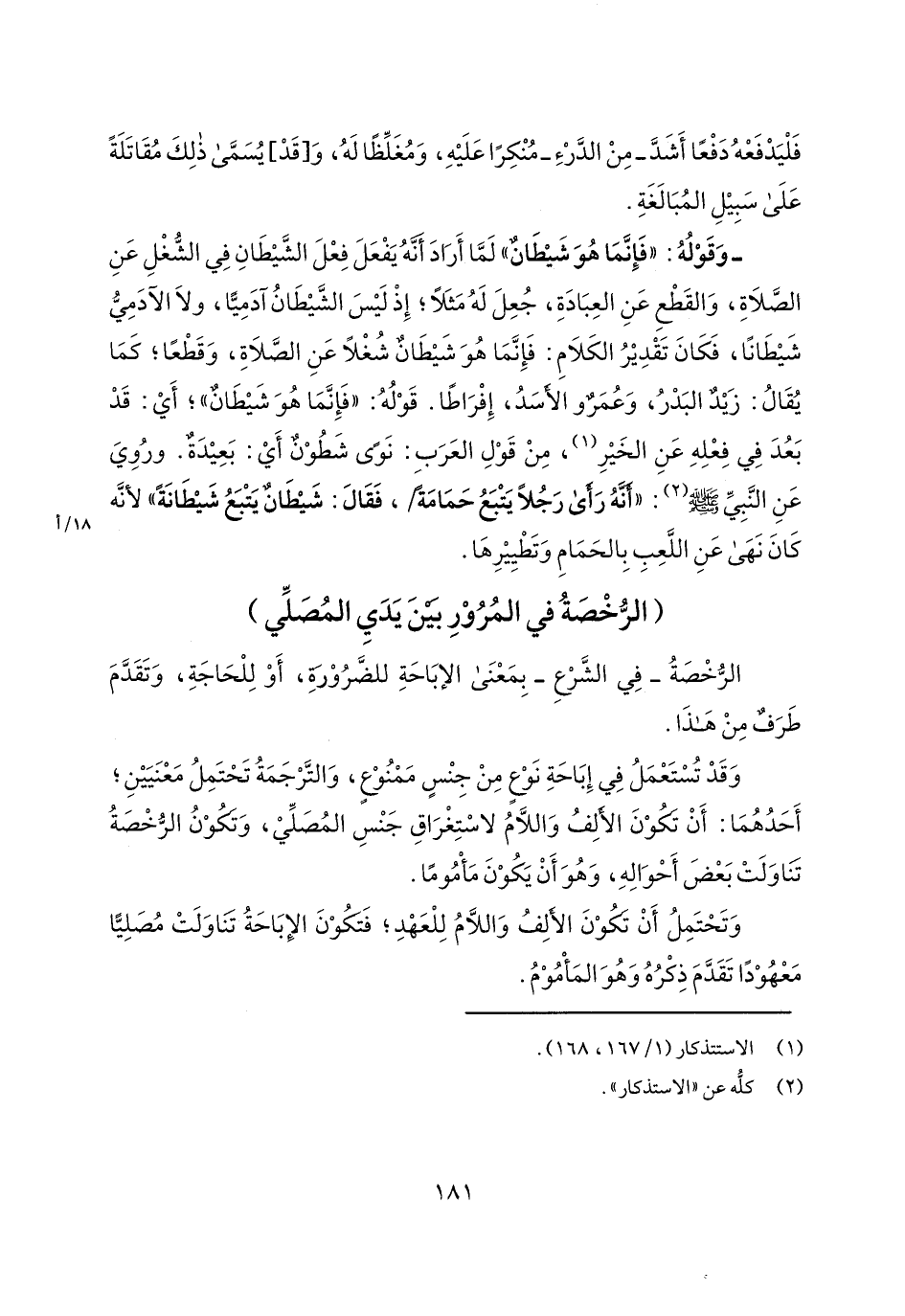 وقوله: "فإنما هو شيطان" لما أراد أنه يفعل فعل الشيطان في الشغل عن الصلاة، والقطع عن العبادة، جعل له مثلاً؛ إذ ليس الشيطان آدمياً، ولا الآدمي شيطاناً، فكان تقدير الكلام: فإنما هو شيطان شغلاً عن الصلاة، وقطعاً؛ كما يقال: زيد البدر، وعمرو الأسد، إفراطاً. قوله: "فإنما هو شيطان"؛ أي: قد بعد في فعله عن الخير، من قول العرب: نوى شطون أي: بعيدة. وروي عن النبي صلى الله عليه وسلم: "أنه رأى رجلاً يتبع حمامة/ 18/أ، فقال: شيطان يتبع شيطانة" لأنه كان نهى عن اللعب بالحمام وتطييرها.