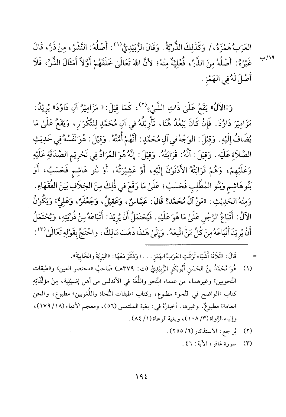 و"الآل" يقع على ذات الشيء، كما قيل: "مزامير آل داود" يريد: مزامير داود. فإن كان يبعد هنا، تأويله في آل محمد للتكرار، ويقع على ما يضاف إليه. وقيل: الوجه في آل محمد: أنهم أمته. وقيل: هو نفسه في حديث الصلاة عليه. وقيل: آله: قرابته. وقيل: إنه هو المراد في تحريم الصدقة عليه وعليهم، وهم قرابته الأدنون إليه، أو عشيرته، أو بنو هاشم فحسب، أو بنو هاشم وبنو المطلب فحسب؛ على ما وقع في ذلك من الخلاف بين الفقهاء. ومنه الحديث: "من آل محمد؟ قال: عباس، وعقيل، وجعفر، وعلي" ويكون الآل: أتباع الرجل على ما هو عليه. فيحتمل أن يريد: أتباعه من ذريته، ويحتمل أن يريد أتباعه من كل من اتبعه. وإلى هذا ذهب مالك، واحتج بقوله تعالى: