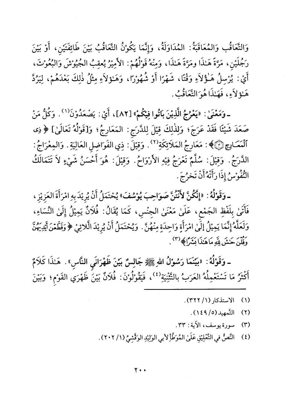 ومعنى: "يعرج الذين باتوا فيكم" [82]، أي: يصعدون. وكل من صعد شيئاً فقد عرج؛ ولذلك قيل للدرج: المعارج؛ و [قوله تعالى] {ذِي الْمَعَارِجِ (3)}: معارج الملائكة. وقيل: ذي الفواضل العالية. والمعراج: الدرج. وقيل: سلم تعرج فيه الأرواح. وقيل: هو أحسن شيء لا تتمالك النفوس إذا رأته أن تخرج.